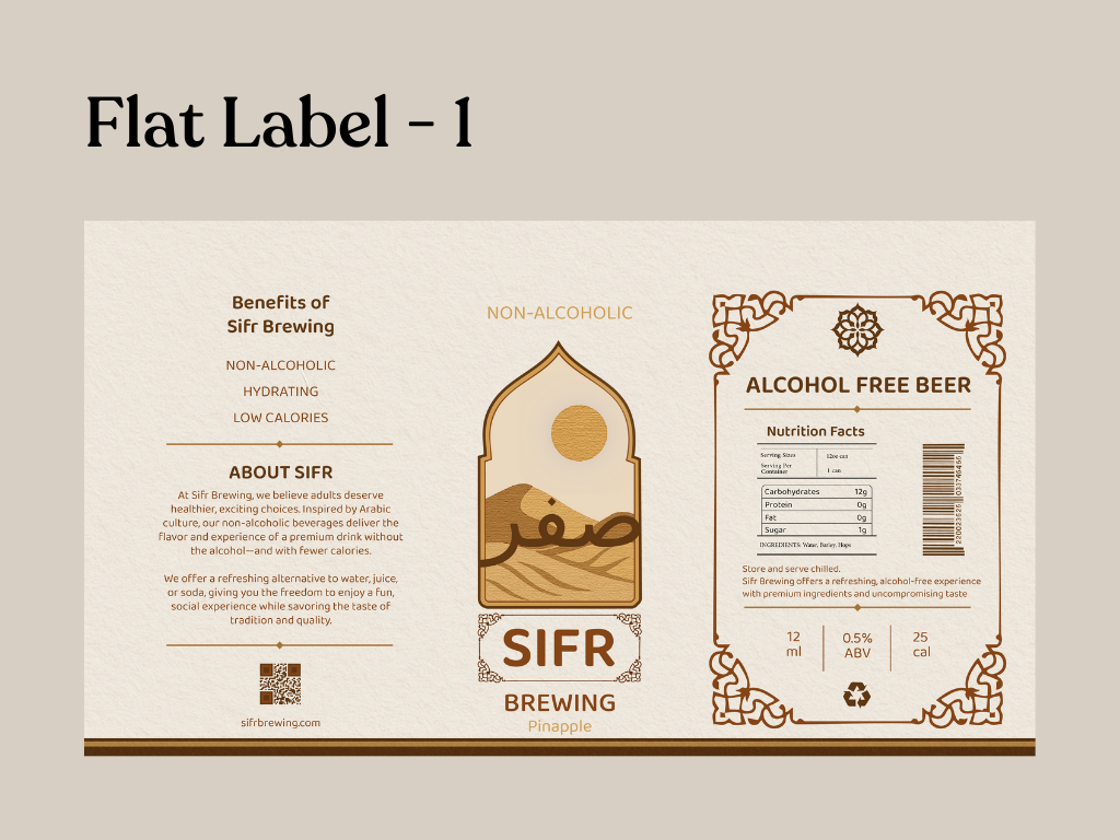 For this project, I created Sifr Brewing, a non-alcoholic beer brand inspired by the serenity and symbolism of the desert. Drawing from Arabic design elements, I used warm earth tones and textured patterns to reflect themes of purity and inclusivity. The brand name “Sifr” means “zero” in Arabic, which emphasizes its 0% ABV. With a tone that is modern yet authentic, Sifr Brewing offers a refreshing oasis for non-drinkers. Advertising concepts and label designs use desert imagery and minimalist layouts to visually express the idea of finding calm in the midst of heat.